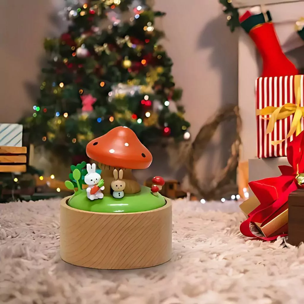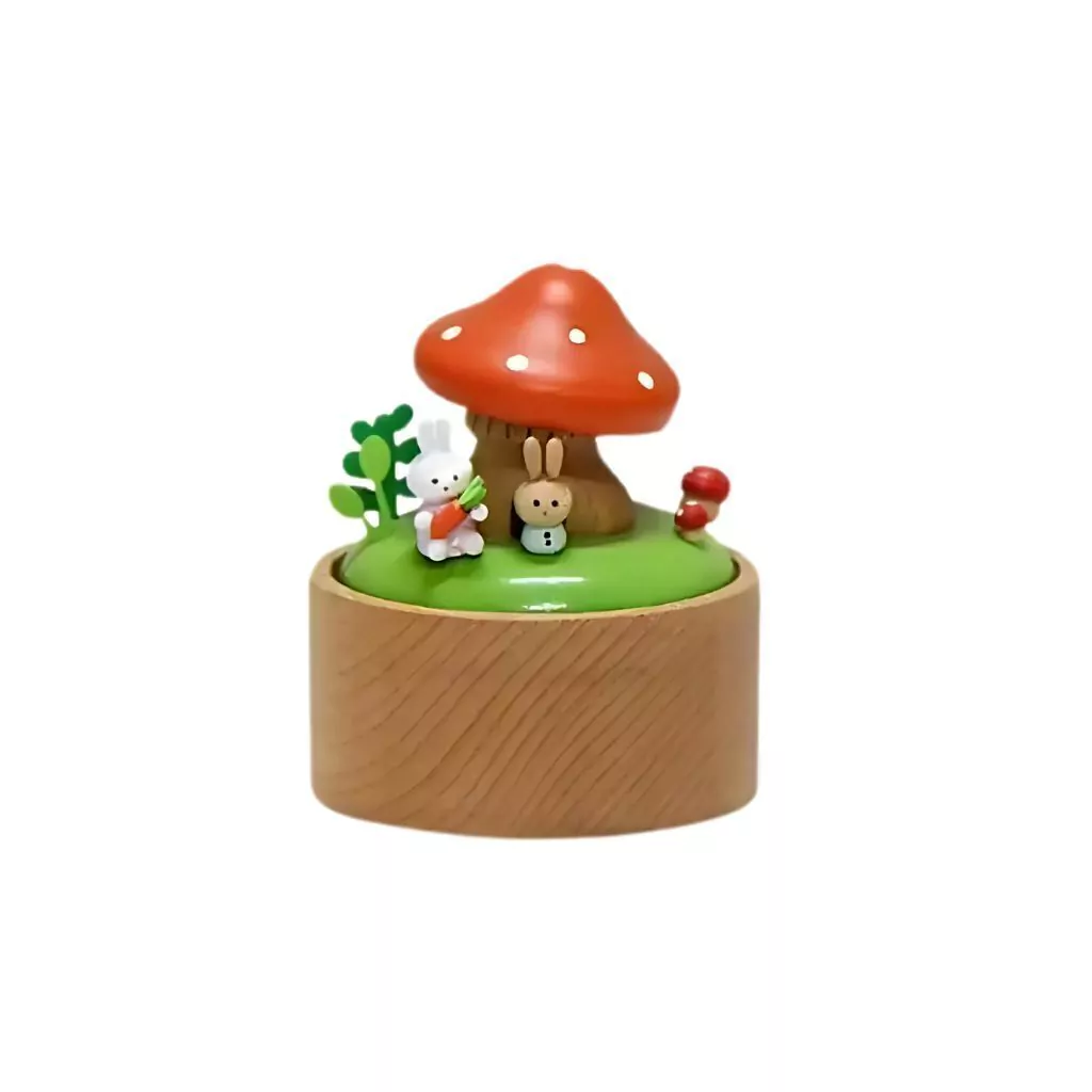 Encante-se com a delicadeza desta caixinha de música artesanal. Inspirada em um cenário mágico, ela traz um cogumelo colorido como ponto central, acompanhado de adoráveis coelhinhos e detalhes em madeira natural. Perfeita para decorar o quarto das crianças, presentear em ocasiões especiais ou simplesmente trazer um toque lúdico ao ambiente.
