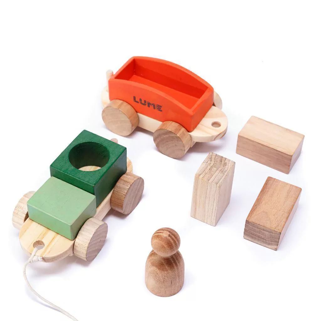 Com a carretinha de transporte, você irá carregar blocos e outras cargas em sua carroceria, puxar o cordão para levar a carretinha passear, e criar histórias.