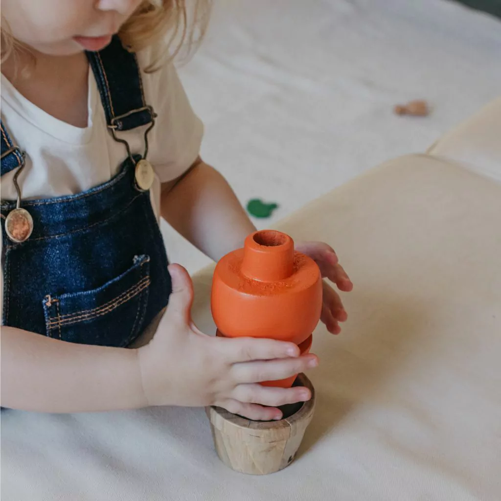 Monte a Cenoura é um brinquedo de encaixe, projetado para que as pequenas mãozinhas possam explorar as peças, combiná-las de diferentes formas, e encontrar a solução para montar a cenoura.